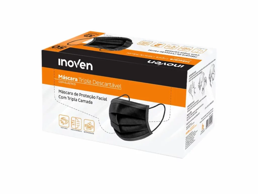 MASCARA DESCARTAVEL TRIPLA COM ELASTICO 50 UNIDADES PRETA INOVEN quantidade
