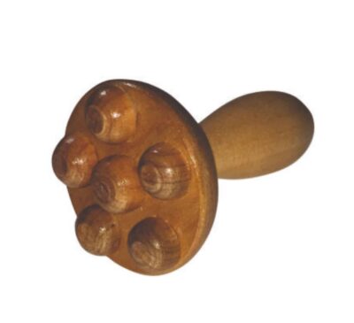 abdômen e região lombar. O massageador é feito de madeira, o que o torna ecologicamente correto e seguro para uso na pele.