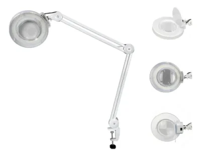 Marca Salus Brasil ,Modelo: Lupa Articulada com fixador para mesa, Variação: Lente de vidro de 10x / Pintura Eletrostática de Alta Resistência Estrutura Aço Carbono Iluminação: LED de Alta Eficiência (120 leds SMD)Suporte para Fixação abertura mínima 2mm / máxima 5,6cm, Diâmetro da Lente 120mm Braço Extensível até 1m Voltagem:Bivolt (127v a 220v)Embalagem do produto : 27x67x13 (LxCxA) Peso: 2kg lupa Articulada com Fixador para Mesa