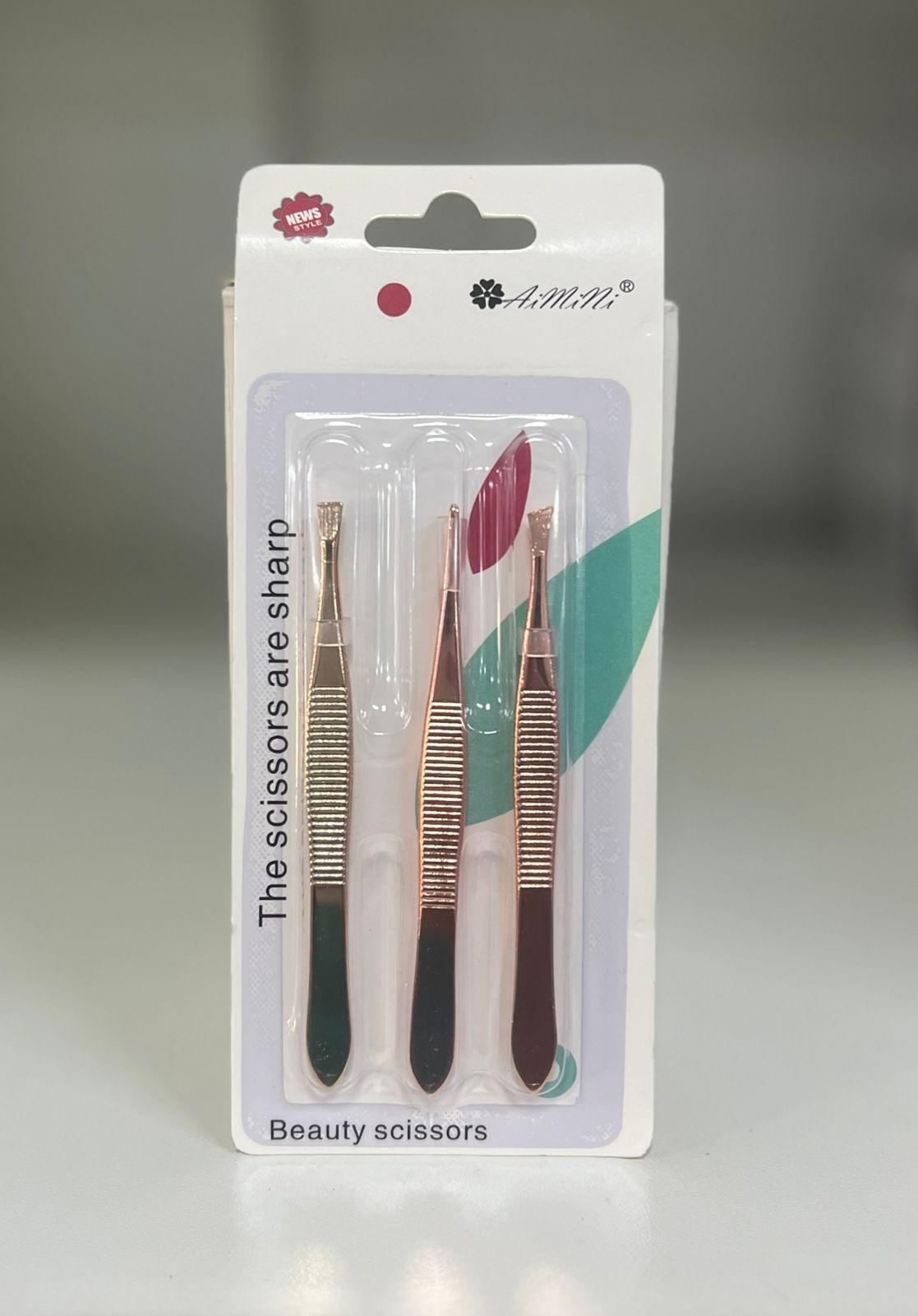Conjunto economico com 3 pinças: ponta reta, diagonal e fina.