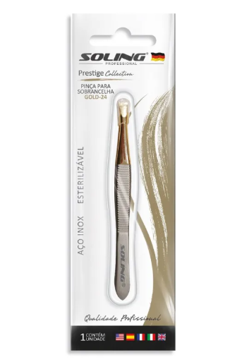 Pinça Soling prestige é fabricada com materiais premium desing refinado, oferecem durabilidade e desempenho superiores, muito prática no manuseio e ótima para retirar pelos com tamanhos médios e longos. Serve especificamente para limpar o contorno da sobrancelha e retirar os pelos em excesso sem precisar mexer no desenho.