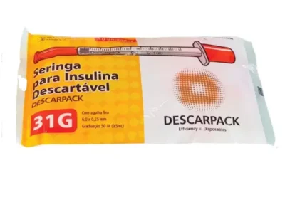 Seringa de uso único para insulina, capacidade 50 UI com linhas de graduação subdivididas em 0,01 ml (1 UI).